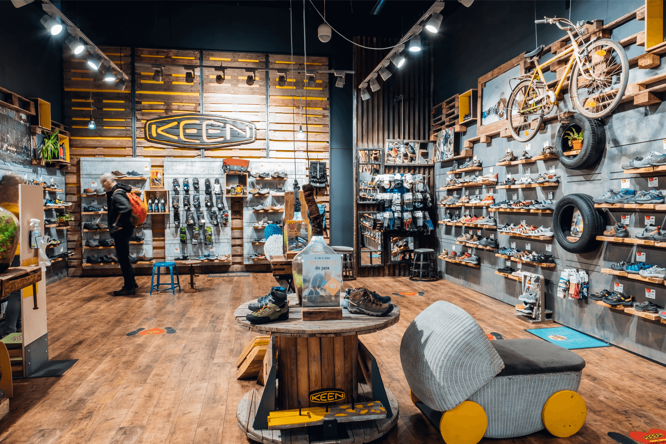 Prodejna KEEN Concept Store je navržena v originálním designu, kdy celé její vybavení vzniklo recyklací použitých materiálů. Boty jsou vystavené na starých paletách a kabelových cívkách. Pokladna je umístěna na zrenovovaném ponku. Celý koncept odpovídá filozofii značky KEEN a pilíři KEEN.Effect, za kterou se skrývá extrémní důraz na kvalitu, společenskou odpovědnost a spojení člověka s přírodou. Prodejna má pro Vás připravenu nejširší nabídku bot značky KEEN. Sortiment tvoří nejnovější modely outdoorové i městské obuvi, sandálů, barefoot bot pro dospělé i děti. Najdete zde i starší modely s výraznou slevou. Součástí nabídky jsou také doplňky k botám, ponožky Hannah a Smartwool nebo lahve Hydroflask a samozřejmě výrobky pro péči o obuv Grangers. V rámci projektu RE.KEEN si můžete vyměnit v prodejně své staré boty KEEN za slevu na nové.